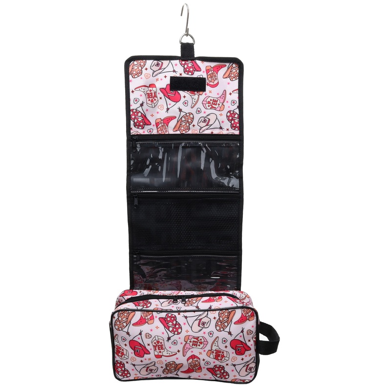 The Showman YeeHaw Jamboree Roll-Up Accessory Bag is the perfect blend of style and function, making it a must-have for travel, the barn, or everyday organization. Featuring a light pink nylon base adorned with a playful hot pink, baby pink, and white YeeHaw Jamboree print, this bag is bursting with western charm, showcasing cowboy hats, cowgirl boots, hearts, and stars.Designed to be compact yet spacious, this roll-up bag easily stores your larger essentials in its spacious main compartment, such as shampoo bottles, shaving cream, or lotion, while keeping smaller items neatly organized. The velcro closure on the flap ensures everything stays securely in place when rolled up, making it easy to transport wherever you go. On the roll-up flap, you’ll find two clear zippered pocketsperfect for keeping smaller items visible and within reachalong with a mesh zippered pocket ideal for items like hair ties, cosmetics, or travel accessories.For added convenience, the bag features a built-in hook, allowing you to hang it from a shower, towel rack, or stall door for quick and easy access. When not in use, simply roll it up and secure it with the velcro closure for compact storage. Whether you’re on the road, at a show, or just need a stylish way to keep your essentials organized, this roll-up accessory bag is the perfect solution!Light Pink Nylon Base with YeeHaw Jamboree Print Fun and stylish hot pink, baby pink, and white design featuring cowboy hats, cowgirl boots, hearts, and stars.Spacious Main Compartment Holds larger items like shampoo bottles, shaving cream, or lotion with ease.Velcro Closure Roll-Up Design Securely fastens for easy transport and compact storage.Two Clear Zippered Pockets Keeps smaller items visible and organized.One Mesh Zippered Pocket Ideal for hair ties, cosmetics, or travel accessories.Built-In Hook Easily hangs from a shower, towel rack, or stall door for quick access.Perfect for Travel or Everyday Use Great for horse shows, rodeos, travel, or barn life.Measures11 x 6 x 3 (Rolled Up)Flap Measures 18 x 9 with 4 x 9 pockets.var TabbedPanels1=new Spry.Widget.TabbedPanels(TabbedPanels1);