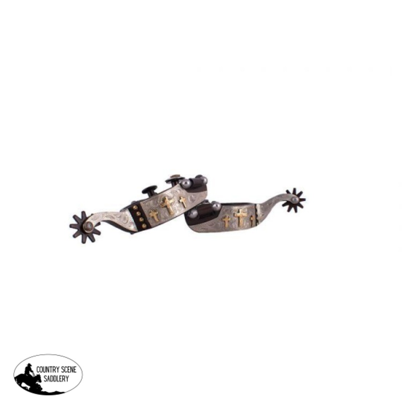Showman Youth size brown steel spur with brass crosses and brass studs with silver engraved overlay. Spur details: 2-1/2″ boot opening, 1″ band, and 2″ shank.