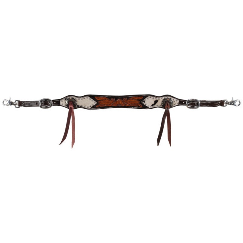 Made from dark oiled leather, this wither strap features medium oiled floral tooling and cowhide inlays, creating a striking design. The addition of silver stud accents and antique slotted conchos with leather ties enhances its Western aesthetic, making it as stylish as it is practical.