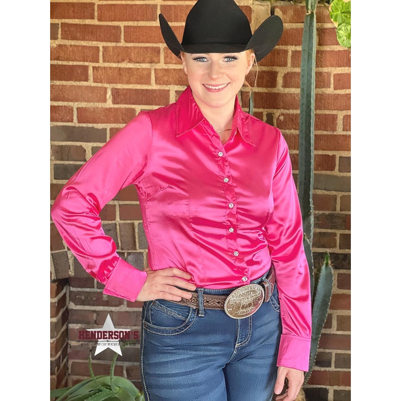 A very classic sleek look for the show pen. This Pink shirt has a beautiful sheen to it! Topped off with Crystal buttons to take it over the top! Poly/spandex blend.