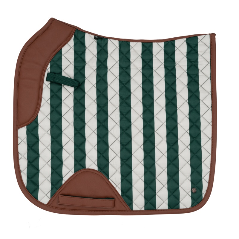 16C Dressage Pad in hunter green & ivory stripe, finished in cognac leatherette.