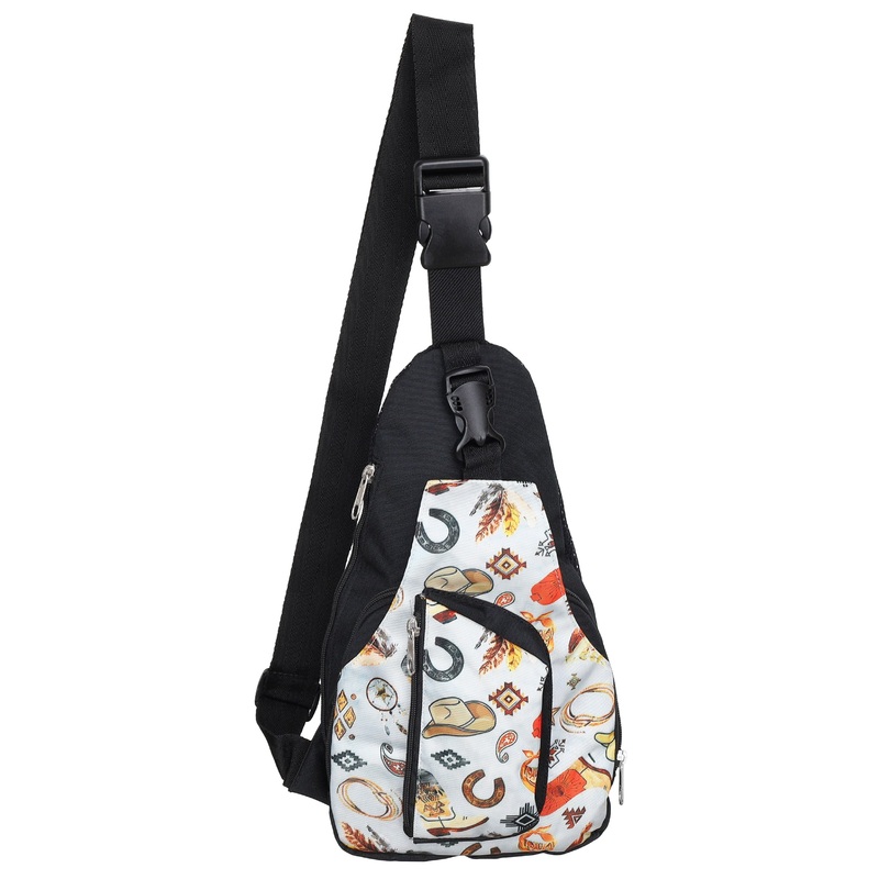 SF78332Saddle up in style with the Showman Wild West Sling Crossbody Backpack where rugged western charm meets everyday convenience. Designed with an eye-catching print featuring cowboy hats, lariats, dreamcatchers, horseshoes, and southwestern patterns, t