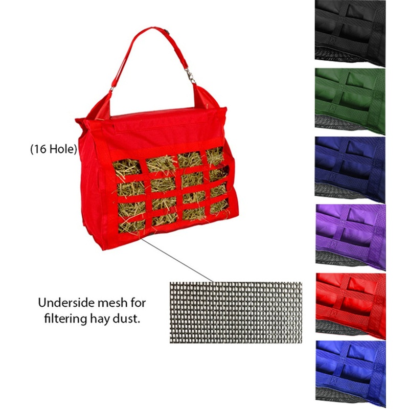 Deluxe top loading hay bag is easy to fill and comes with a top flap that prevents hay from being pulled from the top. The 16 small square pattern on front helps reduce wasted hay while feeding. Made of tough poly with mesh bottom and rods at the top to retain shape. Measures 24″ x 20″ with 10″ wide mesh bottom.- Holds two flakes of hay.- Great for traveling.- Adjustable strap.