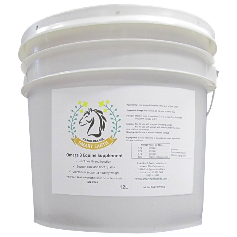 Smart Earth Camelina Oil is a palatable omega supplement that may promote healthy weight gain, support dry skin and coat, and support mane and tail quality. Camelina Oil contains Vitamin E that may help your horse grow a healthier coat. Relative to other vegetable sources of omega fatty acids, camelina oil contains the most balanced profile of omega 3 and 6 with a ratio 1.2-1.6:1 and high ALA content. Smart Earth Camelina Oil is non-GMO, glyphosate free, cold pressed and made in in a human food grade facility. Sustainably produced, Smart Earth uses crops that require minimal irrigation or fertilization, and has a smaller carbon footprint than protein-based omega sources such as fish oils. Produced in Saskatchewan, Canada.