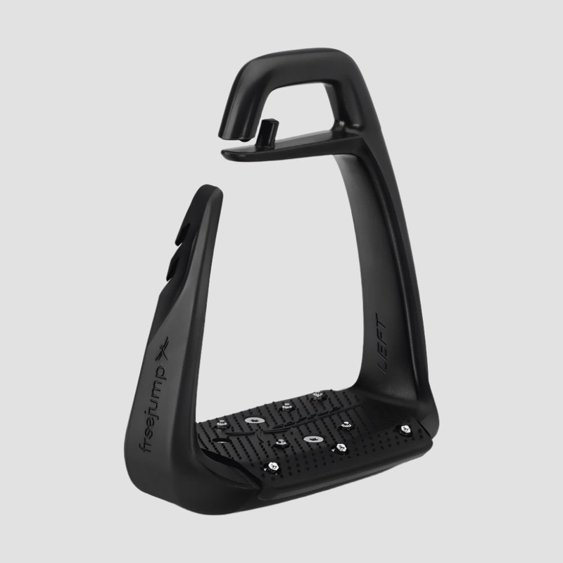 The outer branch of the stirrup is made from Elastollan, a flexible material that deforms and allows the leg to open, making it easier to release the foot in the event of a fall.