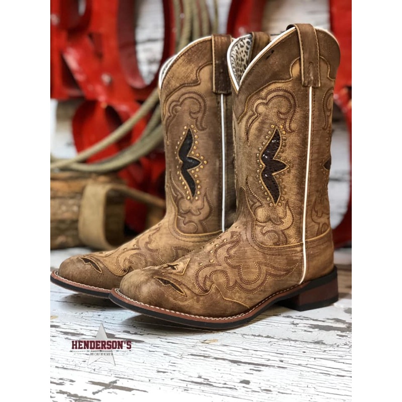 Cowboy approved, the Spellbound boot is crafted in sanded goat leather and features snake print details and pattern stitching & studs. Pull tabs and dip opening allow for easier pull-on. Shaft height 11”.