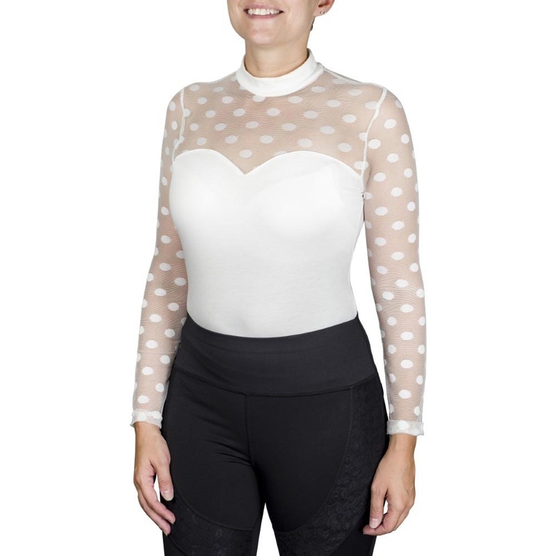 Put a little Spice in your life with Equine Couture’s Spicy Girl Collection! The Spicy Girl Ginger Long Sleeve Shirt by EC is a fun and unique style that you can wear in and out of the ring. The Ginger shirt is made with sheer sleeves and neckline with a fun polka dot pattern throughout. The sweetheart neckline adds a romatic feel and dresses up any breeches.