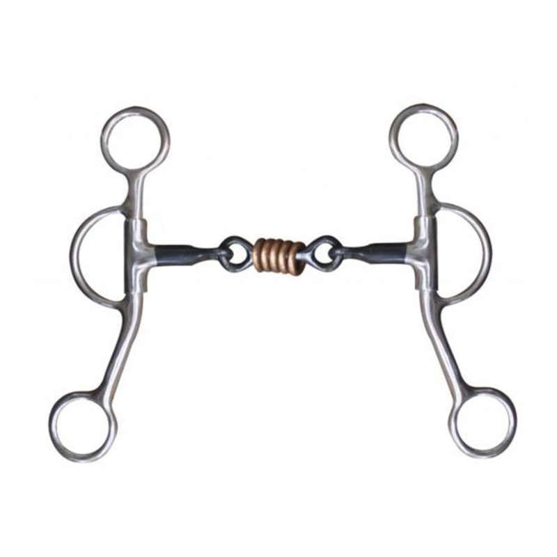 Showman stainless steel 5″ dog bone snaffle with rings. This bit features 7.25″ stainless steel swivel cheeks and a 5″ sweet iron mouth with copper ringed dog bone.
