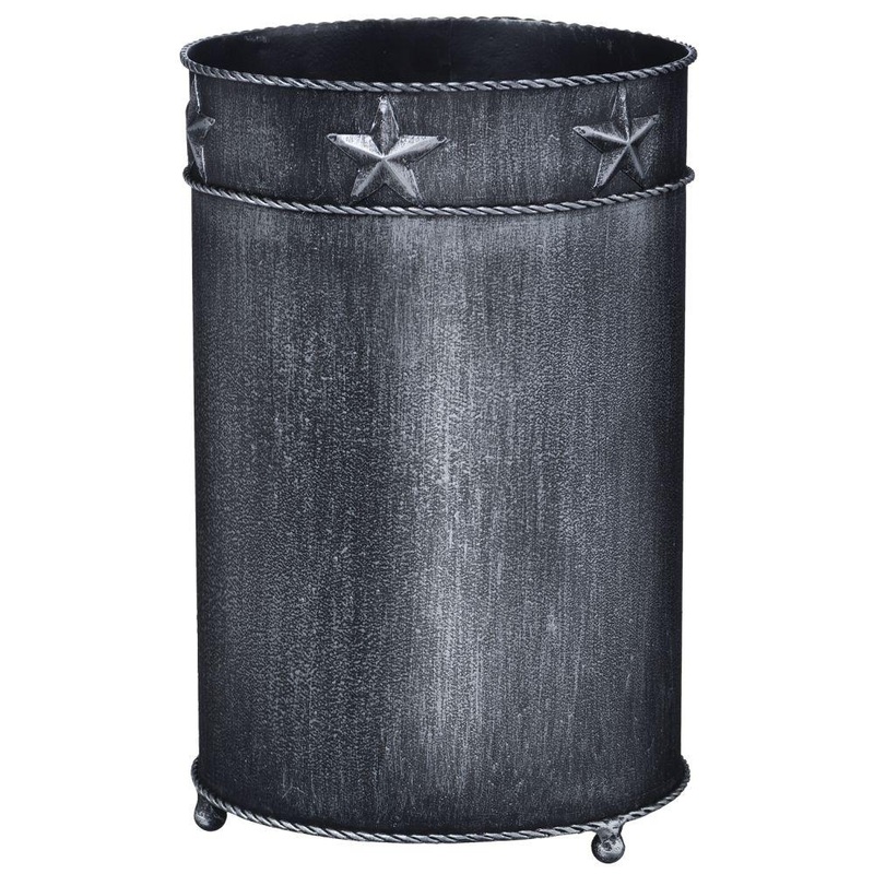 A perfect sized trash can to put in your office, bathroom or horse trailer. Add a touch of the west with the raised star and twisted rope design. 11 tall with 7 opening. Brushed metal finish. Black/silver, black/bronze.