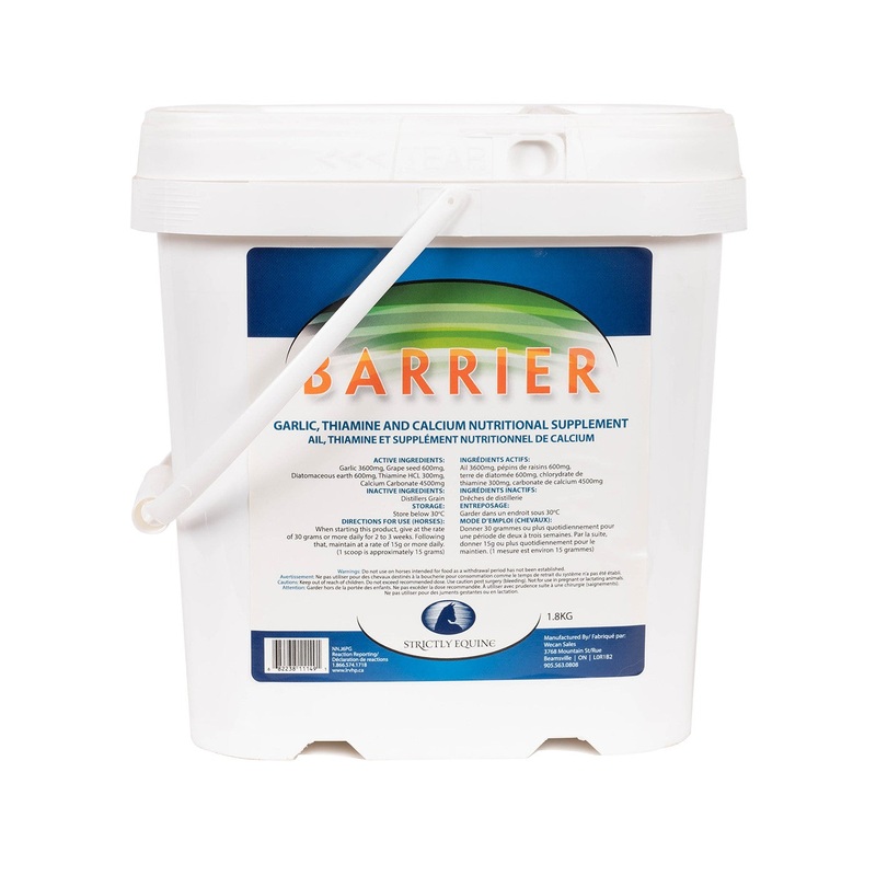 BC Barrier contains a combination of grape seed meal, distiller grains, diatomaceous earth, garlic powder, and thiamine B-1.Contains grape seed meal, distiller grains, diatomaceous earth, garlic powder, and thiamine B-1Made in Canada1.8 kg