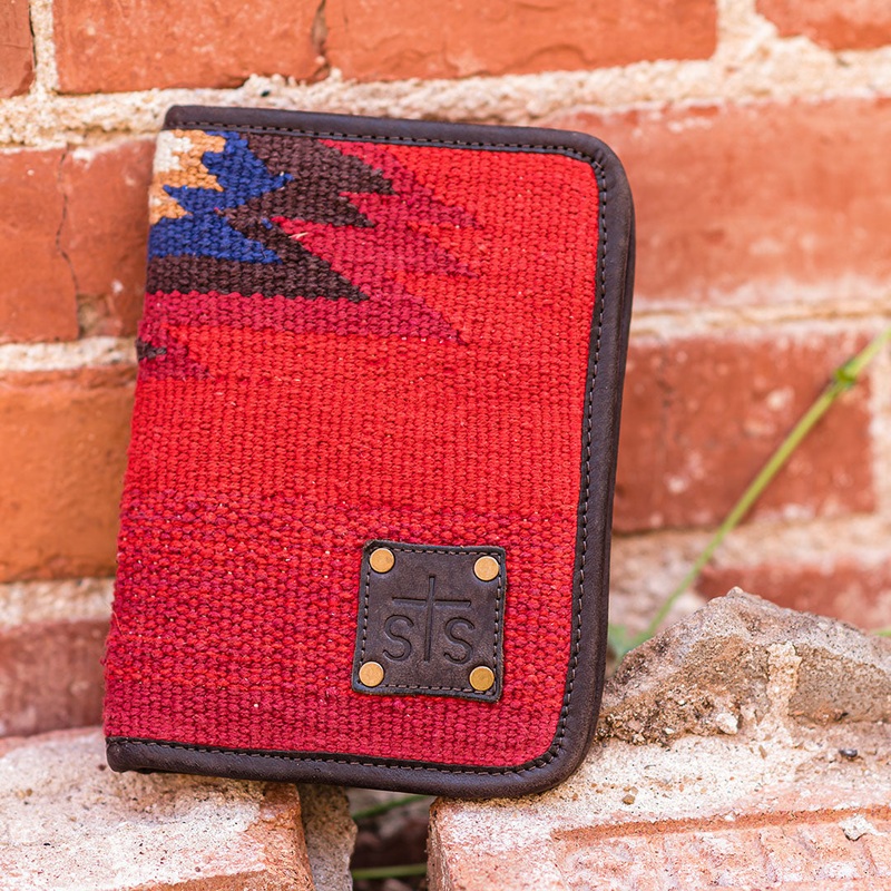 The Crimson Sun is the perfect combination of crimson red serape and matte-natural chocolate full grain leather. The Magnetic Wallet features ombr, Aztec pattern unique to the shape of the wallet.