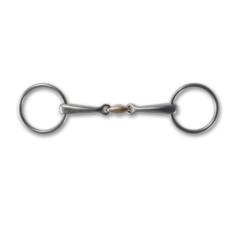 Sweet Copper link for better acceptance.Balanced pressure on tongue and bars with no palate pressure.No nutcracker effect.More forgiving to mistakes caused by riders strong hands.Loose rings enable horse to position bit in his mouth.Rein tension positions