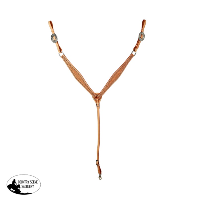 A traditional ‘Y’ shaped breast collar with classic basket tooling, white stitching detail and steel dot border.