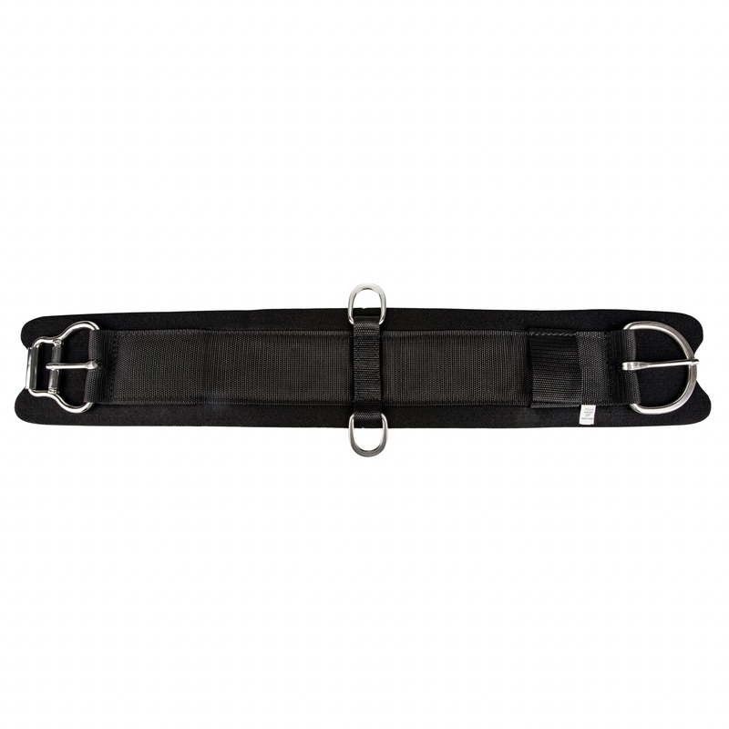 Shock foam girth with nylon backing and saddle felt lining sandwiched over a shock foam core. Stainless steel roller buckles