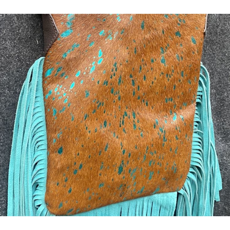 Crossbody Bag with hair on cowhide,teal acid wash,fringe and crossbody strap. This handbag features hair on cowhide, teal suede fringe accent adjustable strap, zipper pocket inside and exterior pocket on back.Measures Approx- 12"H x 9"W, Fringe measures 12