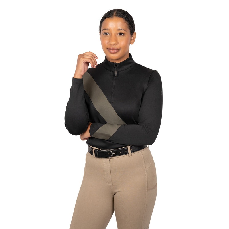 The TemTeq Equestrian Sloane Top offers a breathable, 1/4 zip training shirt for in the saddle and out. Constructed from comfortable 4-way stretch material that is sweat absorbent and offers shape retention with the inclusion of spandex. Complete with a symmetrical design across the chest and sleeve, adding a pop of color.