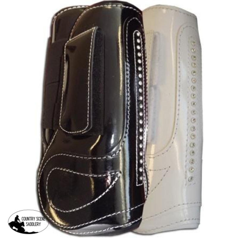 Stylish patent look tendon boots with white detail stitching with secure double velcro straps. Neoprene lined for added comfort. Line of white Crystals for that touch of flash! Available colours: Black or White. Sizes: Cob or Full