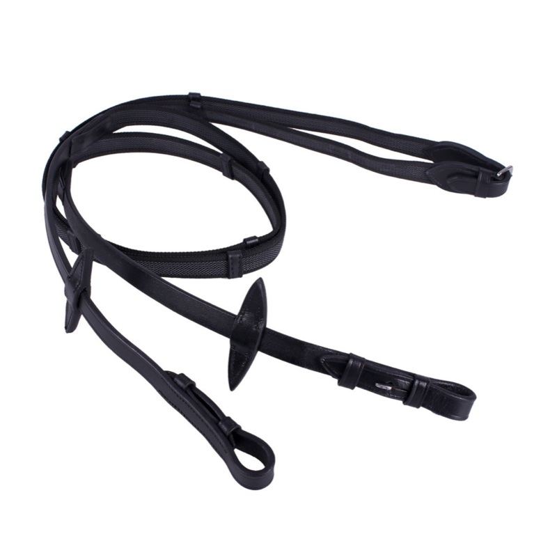 Deze teugels zijn over de hele lengte doorweven met rubber voor een goede grip. Afgewerkt met leren stops en voorzien van martingaalstoppers.