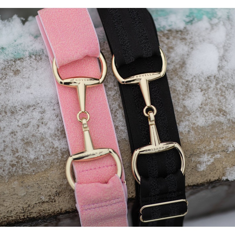 TheNovella Glimmer SnaffleBelt features an etched gold snaffle with the Novella logo to match every one of your Novellastyles. This piece really ties your entire Novellalooktogether! The elastic is 1.5 inches wide for great support and stunning finished look. The Pink version is glimmery all over and the Glimmer Black Beauty features two lines of glimmer on matte black.