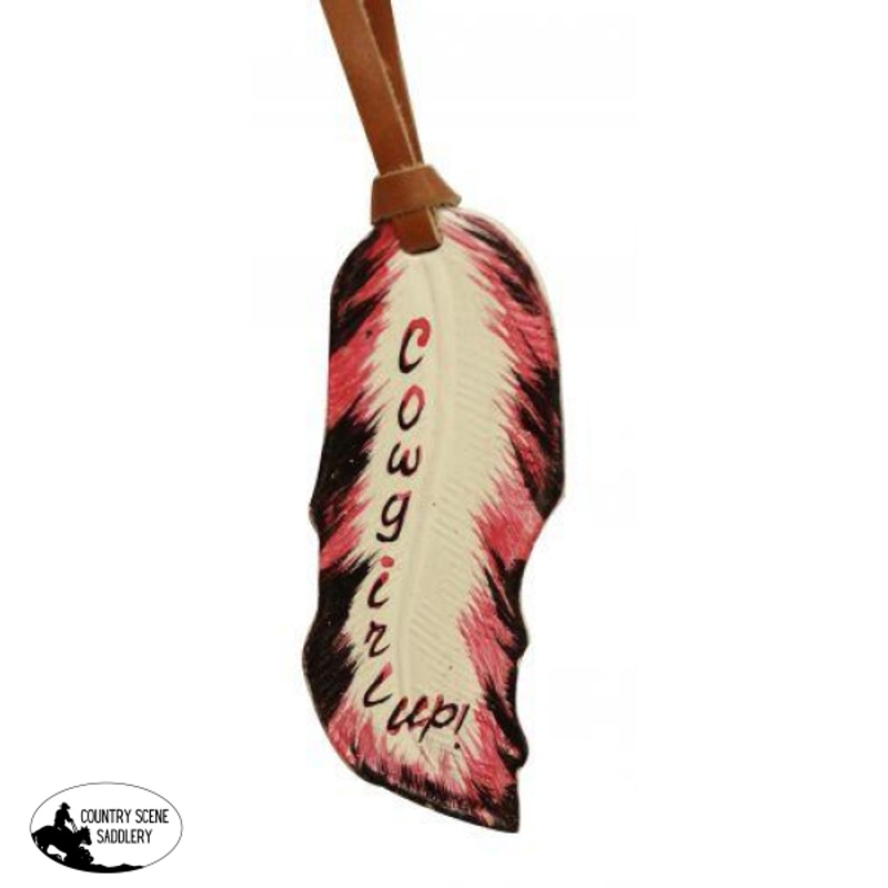 1757935" " Cowgirl Up" pink, black and white hand painted painted leather tie on feather. 5" x 2".