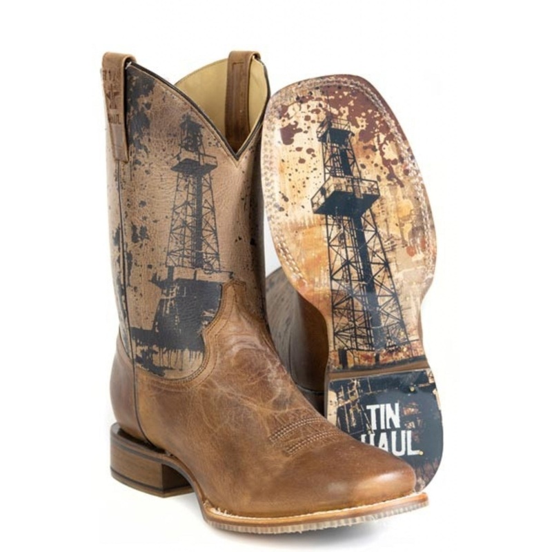 Tin Haul Mens Oil Derrick Square Toe BootsFeatures:Square Toe Burnish Brown Leather VampPrinted Burnish Tan Leather ShaftHandcrafted BootSquare ToeDouble Welt11" ShaftWalking HeelObvious Comfort Removable InsoleLeather LiningTransparent Obvious Sole