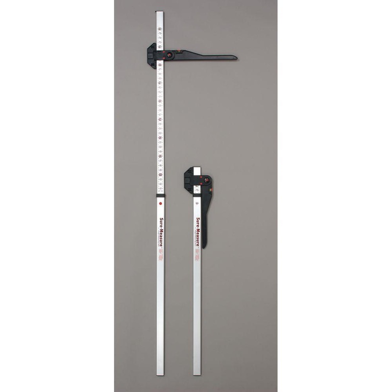Polished aluminum measuring standard with heights ruled from 10 to 19 hands on one side and 100 - 190 cm. on the reverse side. Push button - fold up vertical beam has easy to read plumb vial for accuracy. Telescopic in center for ease of carrying and stora