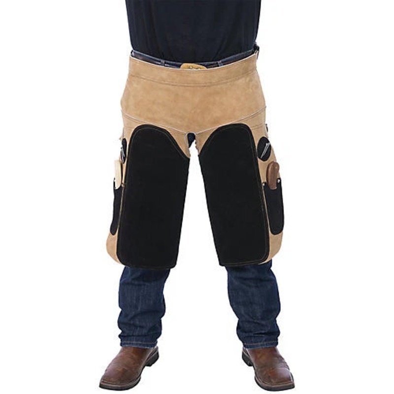 Made of heavy, yet flexible leather with extra protection around the inside of the thighs where you need it most, this professional farrier apron provides superior protection while trimming and shoeing. Fully adjustable at the waist, both sides feature knife pockets and nail magnets.