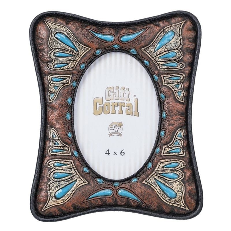Tough1 Butterfly Frame This weathered leather look frame is carved with off-white and turquoise butterfly inspired shapes. Holds a single 4 x 6 photo. Made of resin with hardware for displaying on table or hanging on the wall.