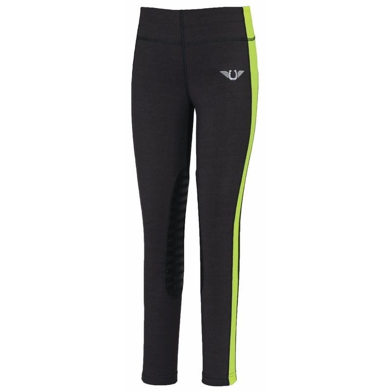 These lightweight poly/spandex schooling tights are breathable and have the convenience of a pull on, lowrise, stretch waistband to keep you comfortable on the hottest days. A ventilated, moisture wicking fabric runs down each leg and continues across the back to ensure the rider stays cool and dry. These tights also feature UltraGripp & imitation leather knee patches and gripper elastic at the ankles. 92% Polyester, 8% Spandex.