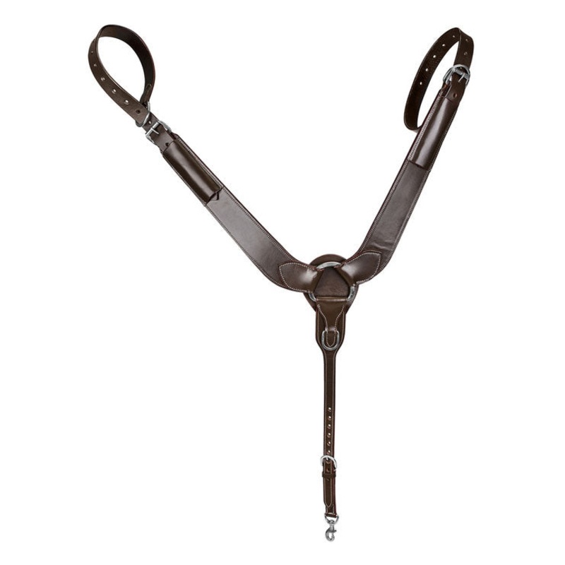 The TuffRider Western Pulling Breast Collar works to pull the saddle forward. Laying up on the neck more than a straight breast collar, the Pulling Breast Collar allows for a full range of shoulder motion and attaches at the saddle swells. Stainless steel hardware ensures a long life for your buckles and rings. Available in dark brown leather with contrast stitching.