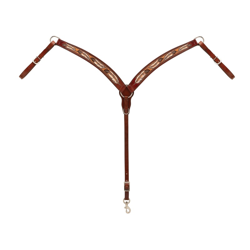 - Contoured horse breast collar made from chestnut leather with intricate carved feather accents