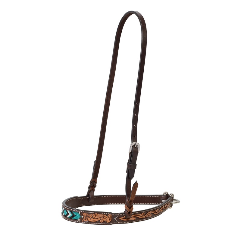 Dark-oiled leather offers a soft and supple feel youll loveIntricate carved floral accents are highlighted with tan stainTurquoise diamond beaded inlays give this noseband classic Western flairNon-rust stainless steel hardware offers long-lasting performan