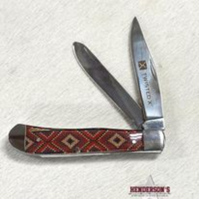 Twisted X trapper knife with two stainless blades 4 1/5" closed.Twisted XPlastic HandleTrapperThis Twisted X Trapper Knife is made with stainless steel blades and has a plastic handle.Proposition 65 Warning for California Residents.