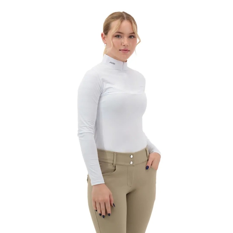 This long sleeve sun and show shirt is made with buttery soft, perforated, anti microbial, sweat wicking fabric that moves with you. Includes a cotton stand up collar that offers a polished look at full zip in any show ring (hunters, jumpers, eq, or dressage) or unzipped for a more casual day to day look. Upper chest, shoulder, back and sleeves are made of very light, perforated fabric, with front lower section in 4 way stretch performance. The full perforation allows for airflow on the hottest days but does not show bra straps.