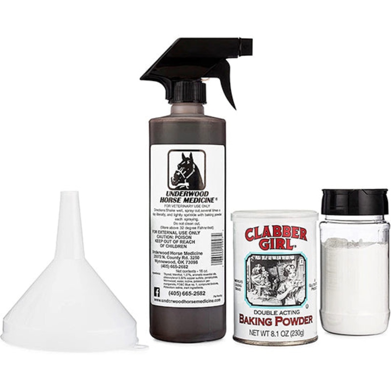 Underwood Horse Medicine Bundle PackOne bottle of Underwoods, sprayer, 10 oz bottle of baking powder, container to apply baking powder and a funnel for transferring baking powder/Underwoods into another bottle.