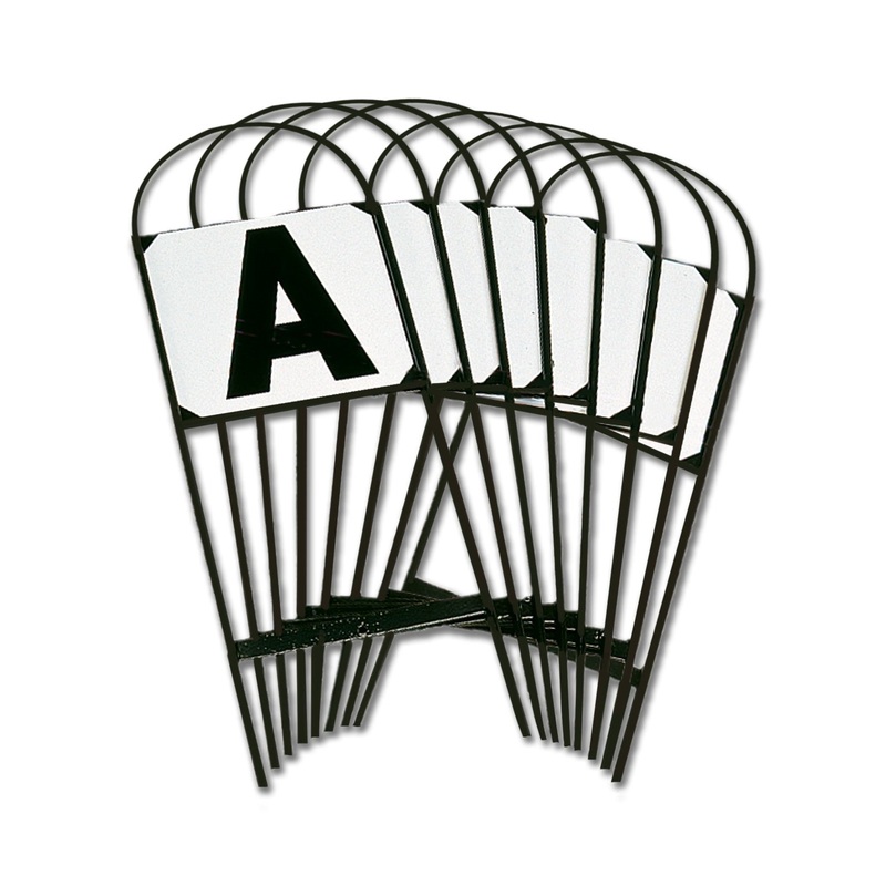 Plastic coated steel frame to be tread into the ground. Weather-proof. 12 pieces: A,K,V,E,S,H,C,M,R,B,P,F Suitable for 20 x 60 m dressage arenas.8 pieces A,K,E,H,C,M,B,F Suitable for 20 x 40 m dressage arenas.Height: 70 cm