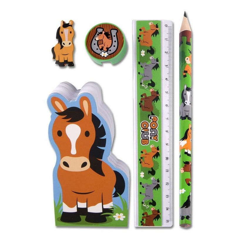 5-piece set includes: pen, horse eraser, pencil sharpener, notepad, 15 cm ruler. Assorted colours. Suitable for children over 3 years.Set dimensions: approx. 5.5 cm x 22 cmNOTE: Not suitable for children under 3 yrs. Small parts can be swallowed - danger o