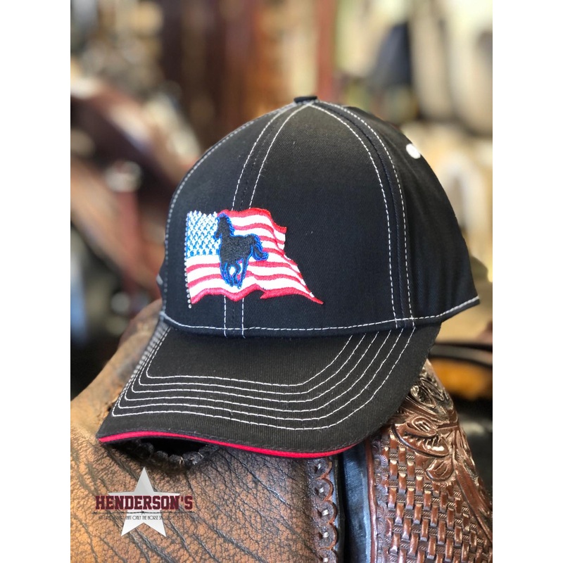 Mid profileCurved bill with contrast stitching6 PanelEyelet ventsSolid backSnapback closureBlackWavy American flag with pony and rhinestone staffOne size fits most